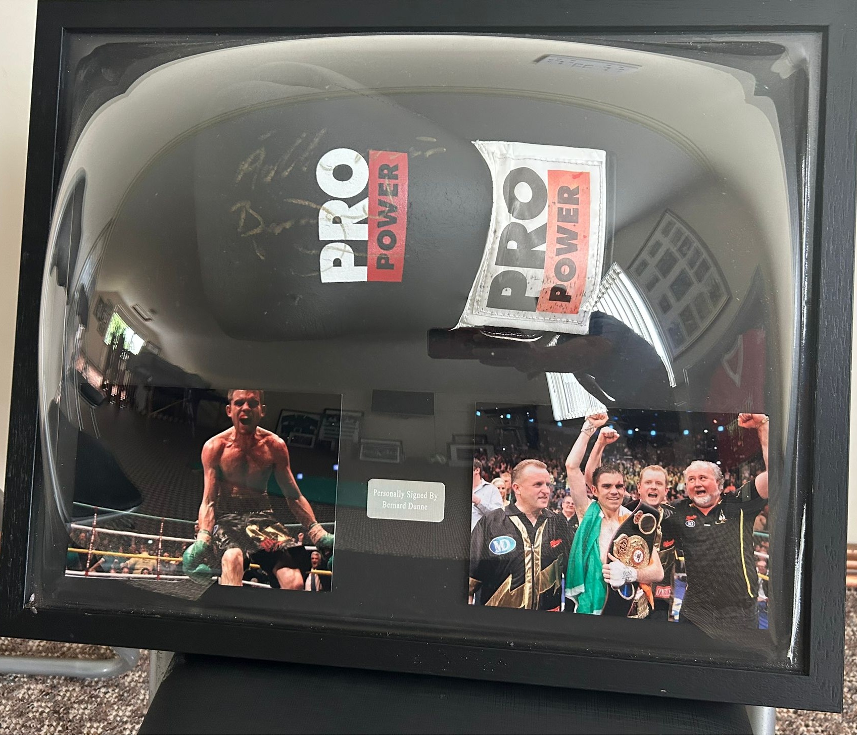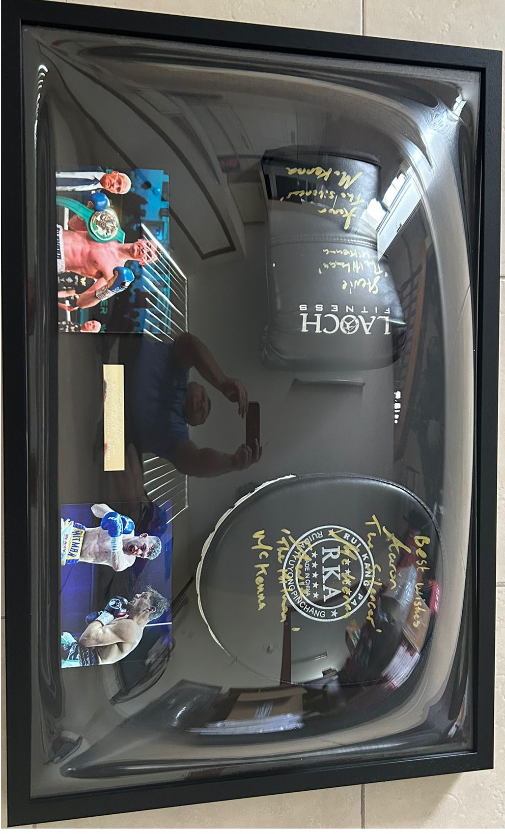 This dual signed and framed boxing glove set by Aaron and Steven McKenna showcases two rising talents in Irish boxing. A unique and exciting piece for boxing fans and collectors.